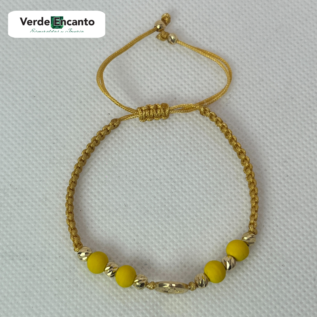 Manilla artesanal tejida con balines en oro diamantado #4, combinados con neopreno color amarillo, que aporta un toque juvenil y distintivo. En el centro, una medalla del Divino Niño, símbolo de protección y fe.