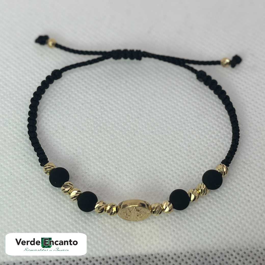 Manilla tejida con balines en oro diamantado #4 y balines de neopreno negro, logrando un diseño moderno y sobrio. Incorpora una medalla de San Benito, ideal para uso diario con un significado espiritual.
