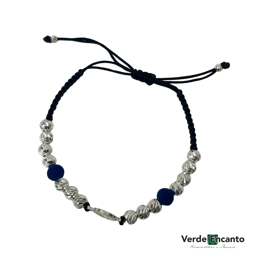 con envíoManilla moderna elaborada con balines diamantados en plata #5, combinados con neopreno color azul oscuro que aporta un estilo contemporáneo y resistente. Al centro, un herraje de San Benito en plata, símbolo de protección y fe.