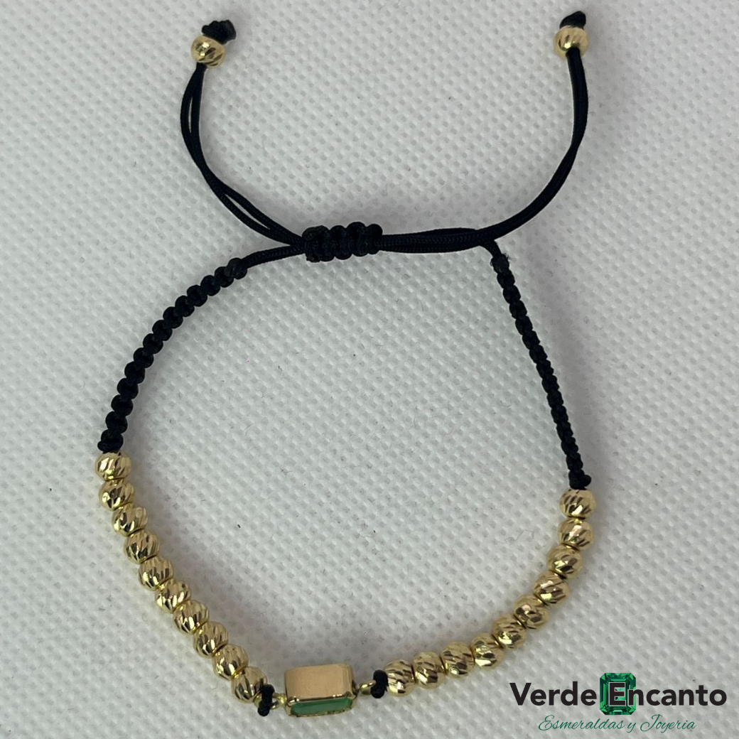 Manilla artesanal tejida a mano con hilo negro de alta resistencia, decorada con balines diamantados en oro 18K, que aportan brillo y sofisticación. En el centro resalta un herraje cuadrado en oro 18K con esmeralda natural, cuidadosamente engastada, convirtiéndola en una pieza fina y exclusiva.